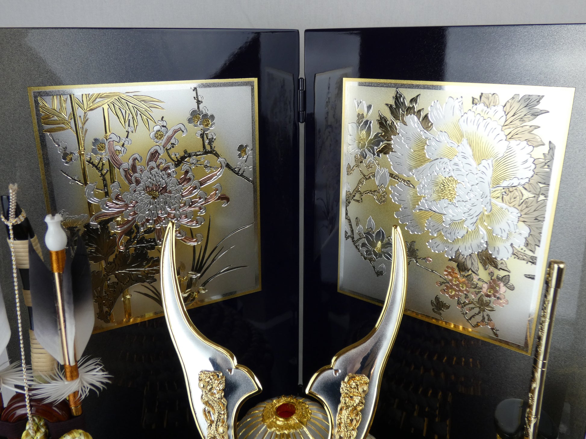 屏風に彫金細工で描かれた牡丹柄も美しく、