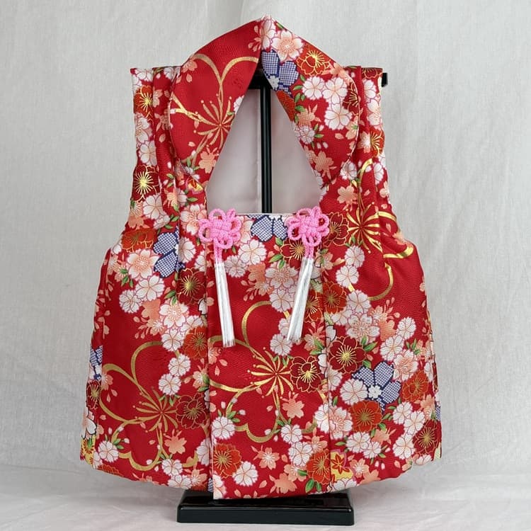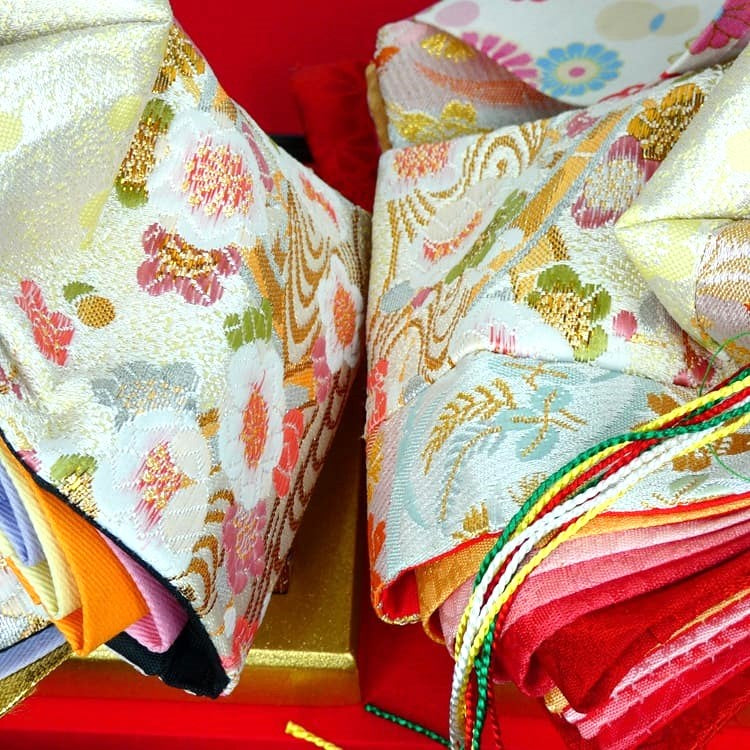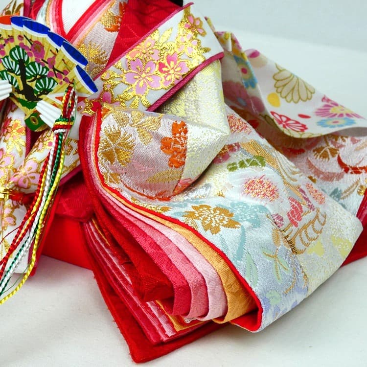 お人形の衣裳と背景の絵柄を揃いの金襴織で仕立て、